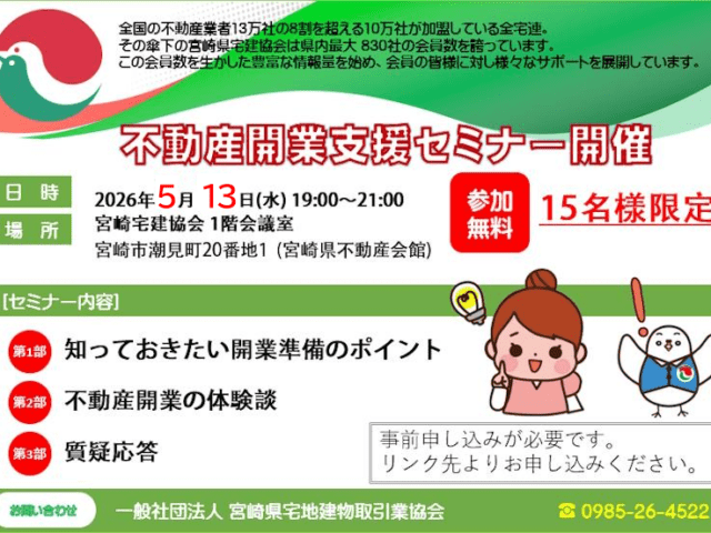 不動産業の開業をお考えの方、現在不動産業に従事していて将来独立開業を目指している方、不動産業に興味がある方などを対象に「不動産開業支援セミナー」を開催致します。 ・開業費用はどの程度必要なのか? ・どんな事務所にすればいいのか? ・仕事はどのように進めるのか? このような開業に関する疑問を、座談会形式で当協会の役員等がわかりやすく解説します。 ■セミナー内容 第1部:開業準備のポイント・スタートアップ